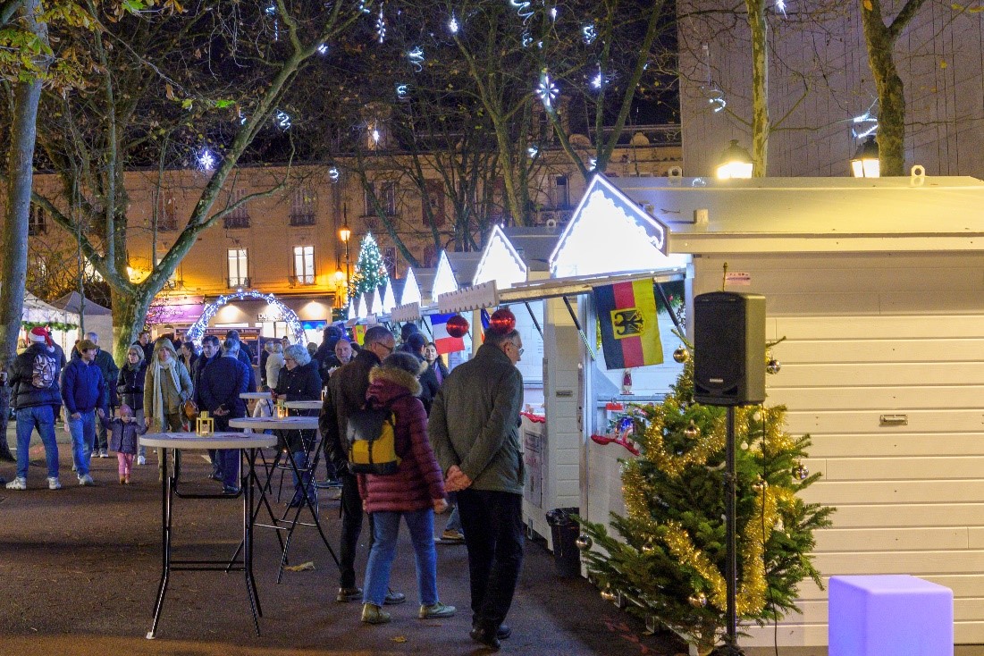 Am nächsten Morgen ging es um 09:30 Uhr bereits Richtung Platz an der Kirche St. Marguerite. Die Chalets wurden hübsch weihnachtlich verziert und mit den Stollen, Lebkuchen und dem Glühwein bestückt. Die Jumelage du Vésinet hatte wieder den Tee-Salon und den Crepes-Stand. Die weiteren Städtepartner ihre heimischen Köstlichkeiten. Es waren nun einige Chalets mehr als in den Vorjahren, da noch einige örtliche Vereine ihre Waren anboten und die gewerblichen Anbieter das Angebot mit Schmuck, Kerzen, Baumschmuck und Kaltgetränken erweiterten. Für die Kinder waren ein Karussell und eine Hüpfburg aufgestellt.
